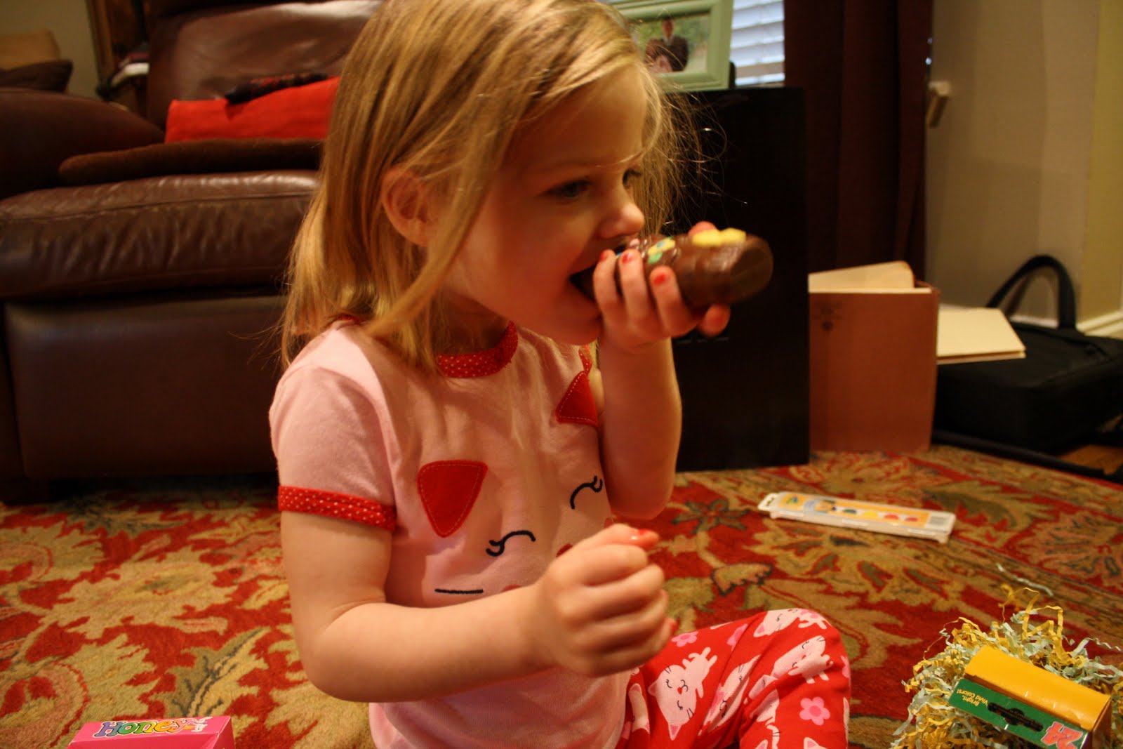 Clara was so excited to dig in, there was literally no stopping her. Adam and I just decided that we might as well let her - at least we would both be home to tag team the candy crazies! She ate every piece of candy in her basket - luckily the chocolate bunny was hollow!
